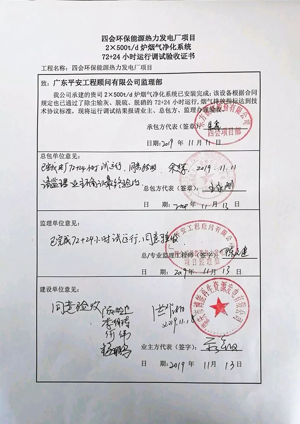我公司承建的四會(huì)環(huán)保能源熱力發(fā)電廠(chǎng)項(xiàng)目煙氣凈化工程于2019年11月11日通過(guò)72+24小時(shí)運(yùn)行驗(yàn)收。