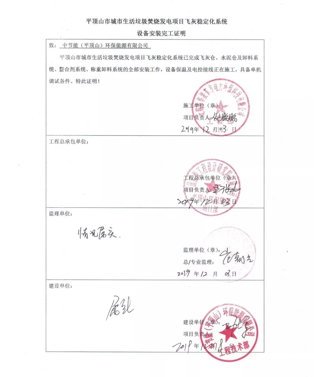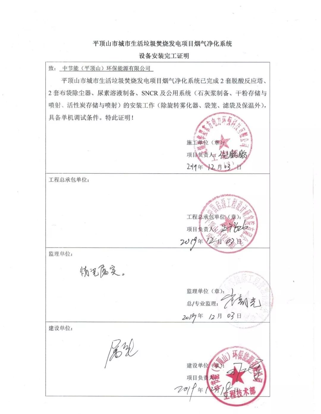 我司承建的河南平頂山2x500t/d生活垃圾焚燒發(fā)電項目煙氣凈化工程于2019年12月03日設備安裝完工,具備單機調(diào)試條件。