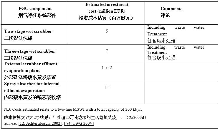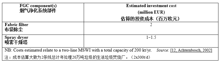 運行成本,包括干式吸收劑直噴系統(tǒng)維護(hù)成本,輸送系統(tǒng)的能源消耗成本,吸收劑成本(噸垃圾1公斤消石灰消耗量),總計為0.17-0.29歐元噸垃圾。