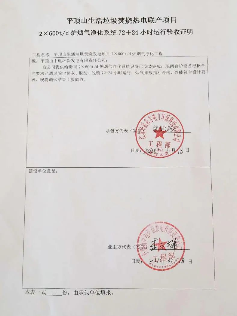 我公司承建的河南省中電投平頂山生活垃圾焚燒熱電聯(lián)產(chǎn)項目煙氣凈化工程于2021年1月3日通過72+24小時試運行。