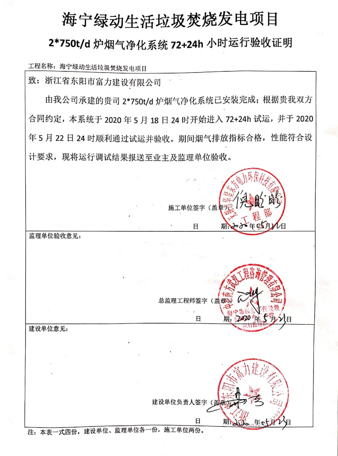 我公司承建的浙江省海寧市生活垃圾焚燒發(fā)電項目煙氣凈化工程于2020年5月18日通過72+24小時試運行。