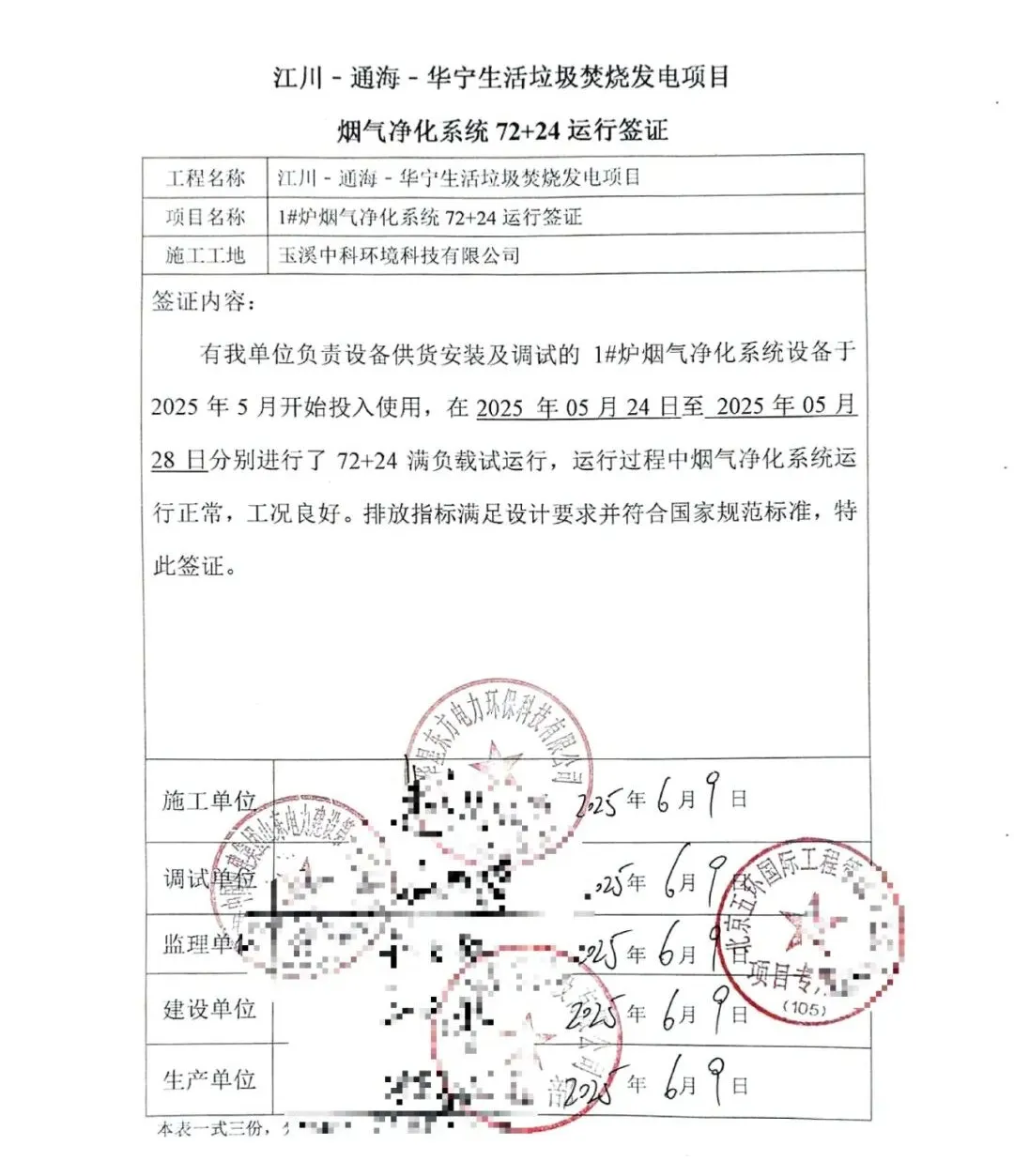 我公司承建的云南省玉溪市江川-通海-華寧生活垃圾焚燒發(fā)電項(xiàng)目煙氣凈化工程于2025年05月28日通過(guò)72+24小時(shí)試運(yùn)行。