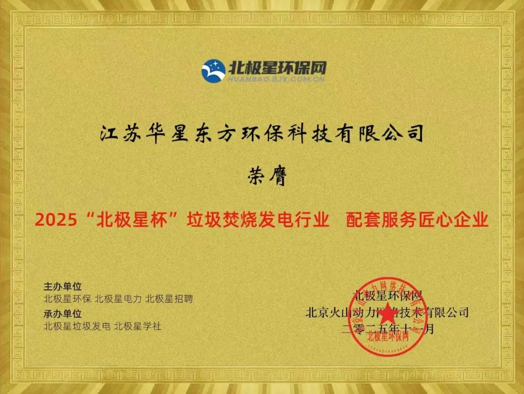 2025年9月,江蘇華星東方受邀參與“北極星杯”2025年度垃圾焚燒發(fā)電行業(yè)評選盛典。此次評選歷時逾月,歷經(jīng)緊張投票、專家評審及評選委員會綜合考量,我司最終在眾多入圍企業(yè)中嶄露頭角。自2020年度(首屆)垃圾焚燒發(fā)電行業(yè)評選活動獲獎以來,江蘇華星東方已連續(xù)六屆榮膺“配套服務(wù)匠心企業(yè)”殊榮!
