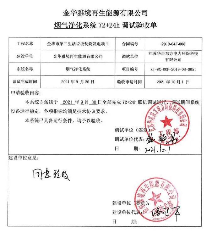 The flue gas cleaning (FGC) project undertaken by Huaxing East for the 2nd waste incineration power plant in Jinhua, Zhejiang passed the 72 + 24 hour trial operation on October 1, 2021.